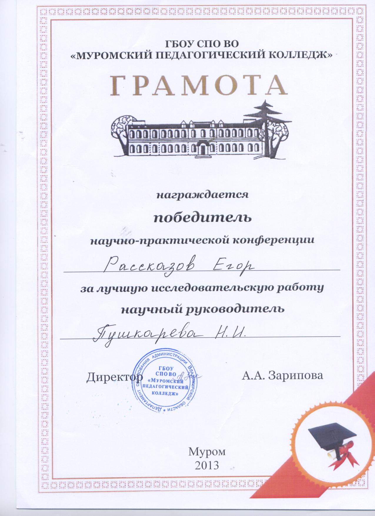- в межрегиональном открытом научно-практическом форуме «Молодежь и наука», посвященного 70-летию образования Владимирской области и 70-летию Владимирского политехнического колледжа, где стал победителем в номинации « За актуальность исследования в контексте глобальных проблем современности».